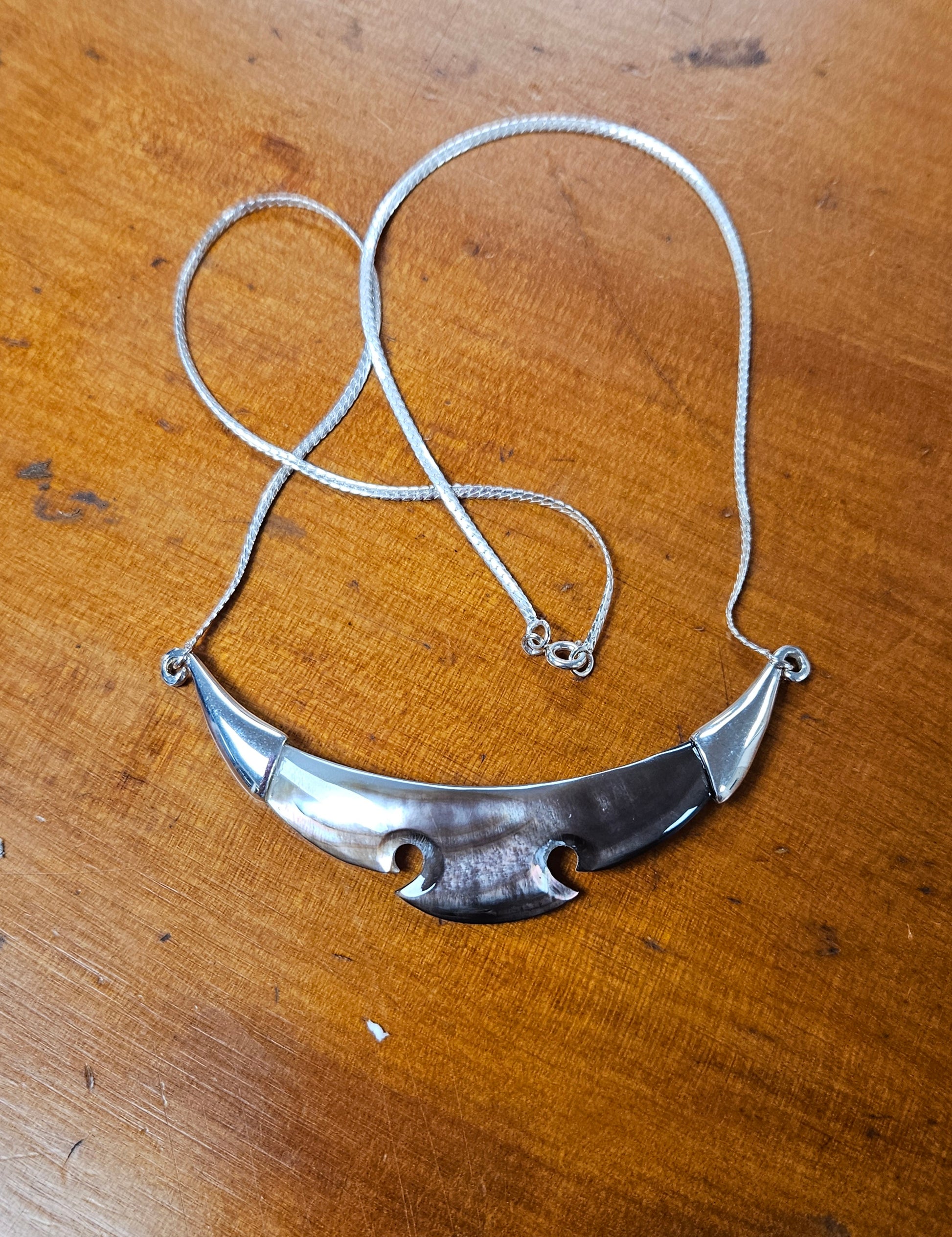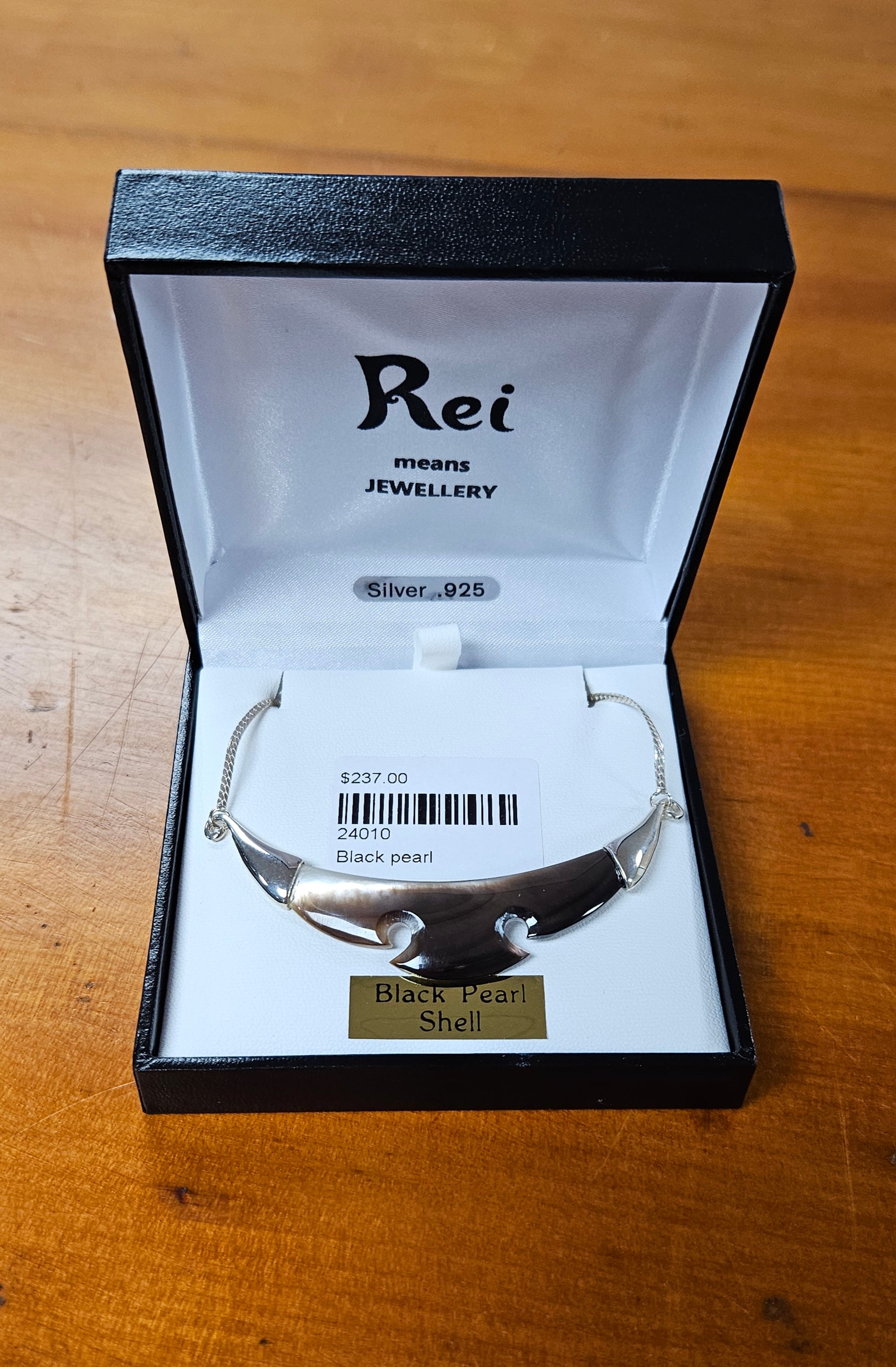 This is a lovely piece of black pearl shell, styled in sterling silver , to sit on the neck line.