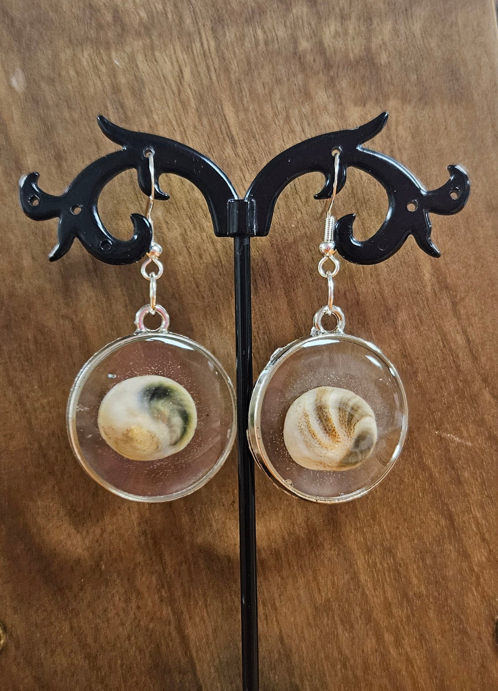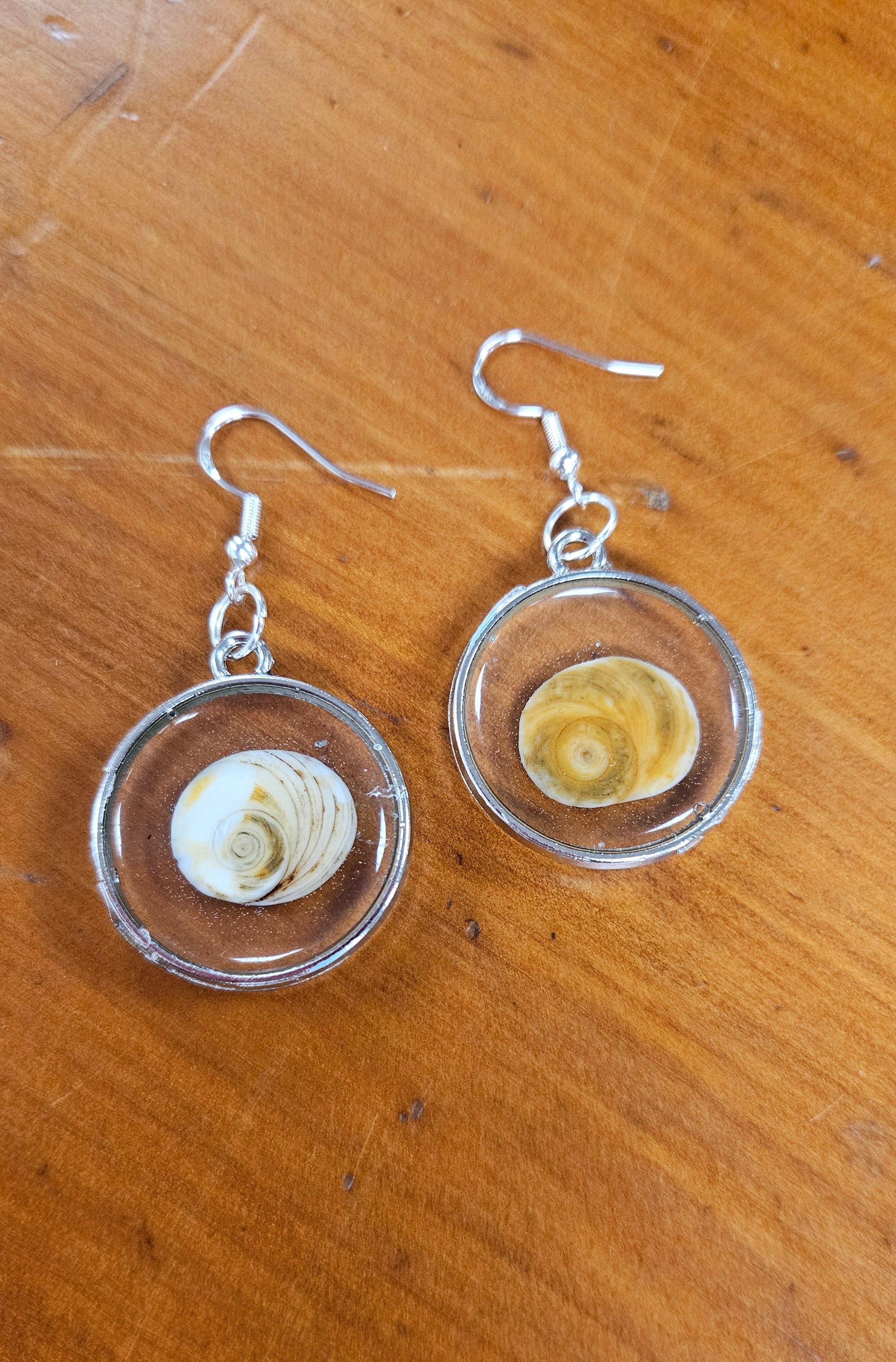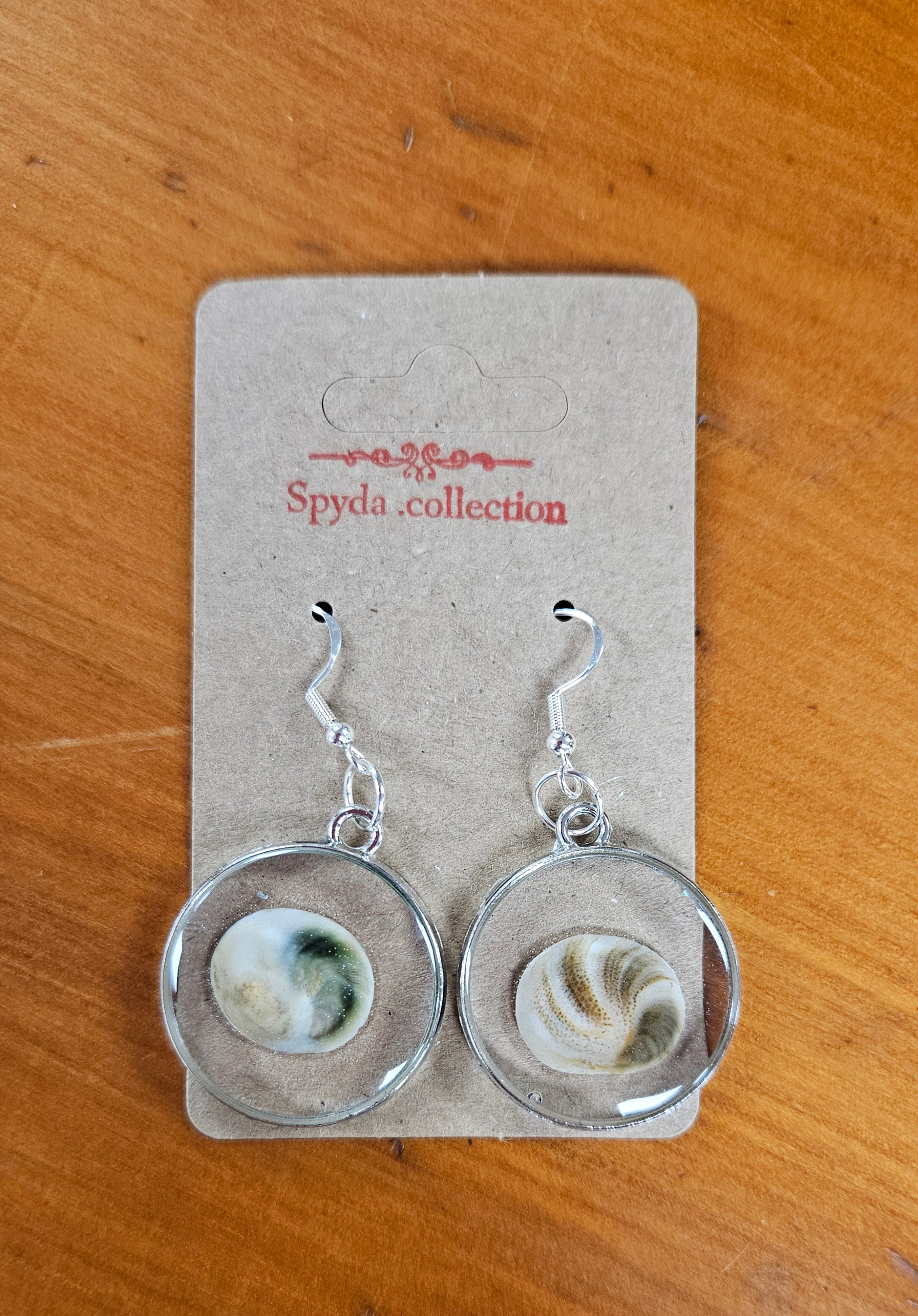 Lovely cats eyes New Zealand shells set in resin, with sterling silver hooks.