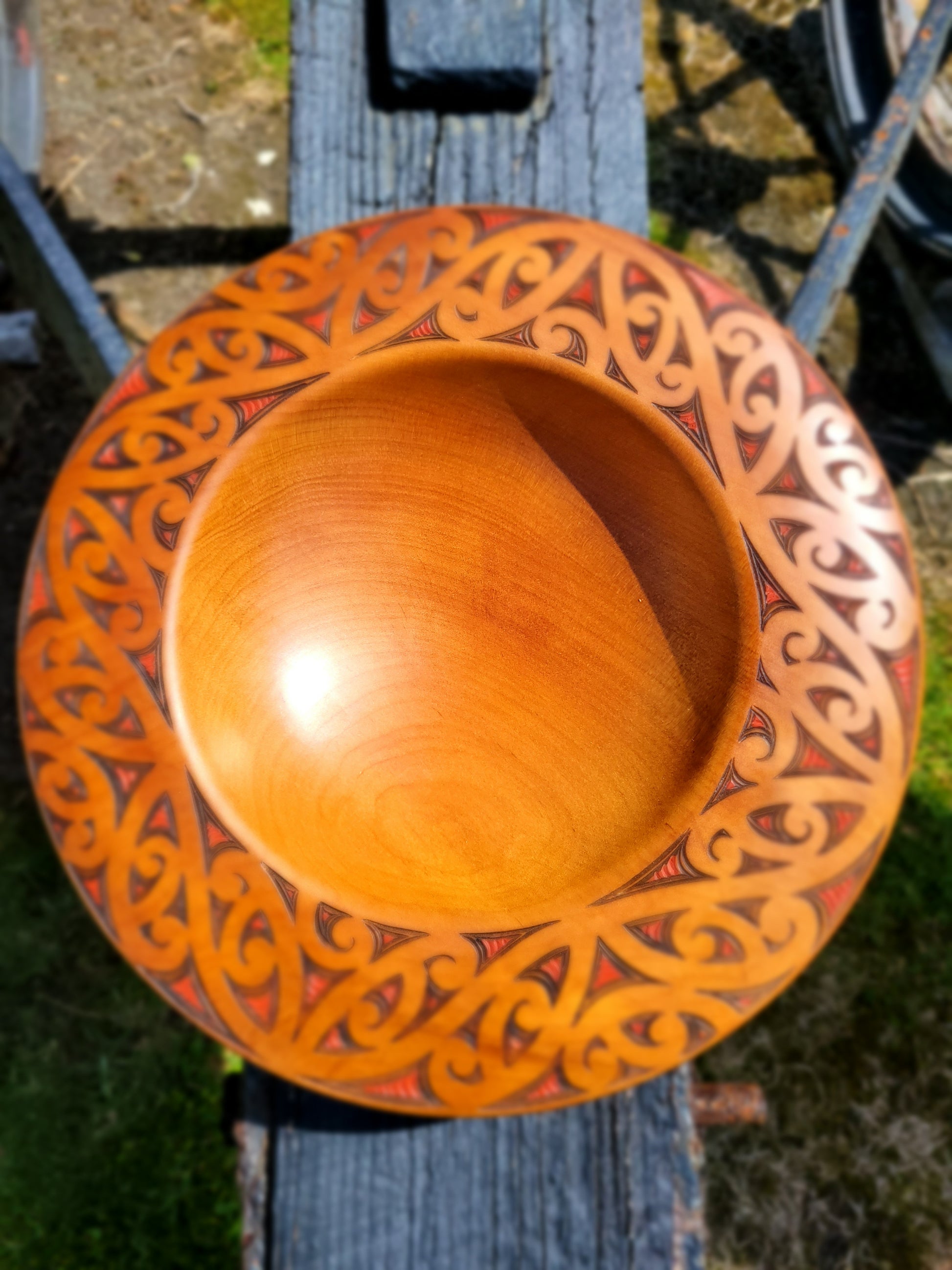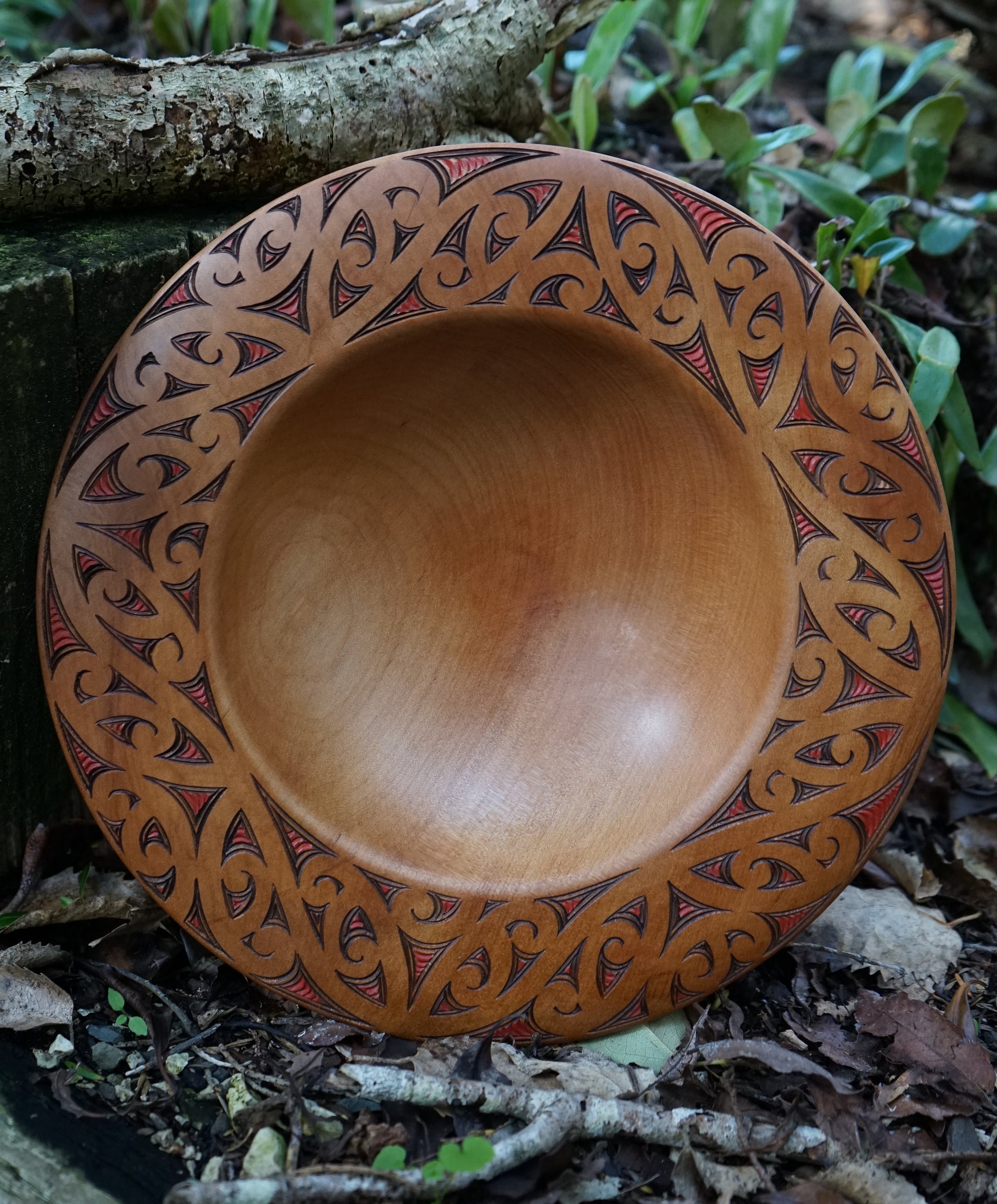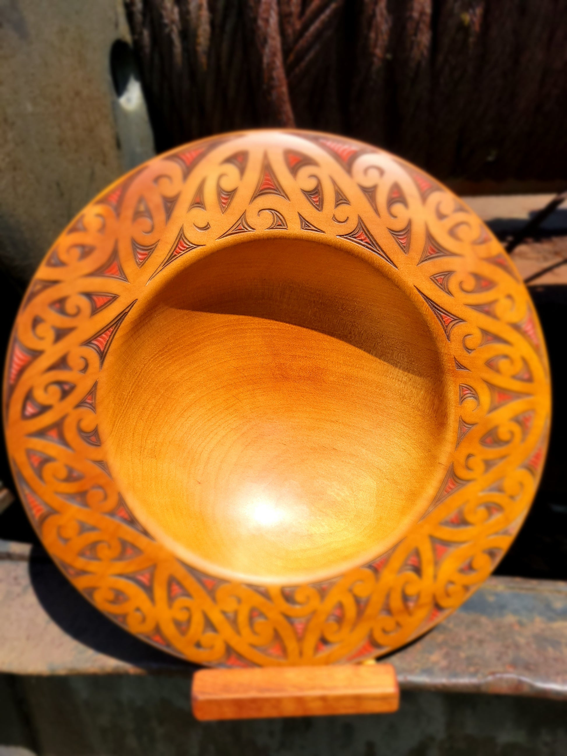 Turned swamp kauri bowl with relief carving. Decorative red ink highlights the intricate detail carving.